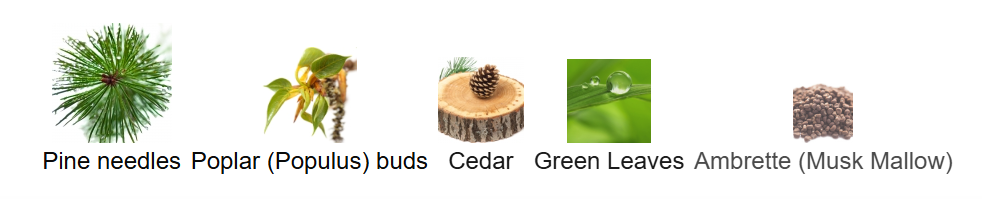 ⏺️ Pine Needles, Poplar (Populus) Buds, Cedar, Green Leaves and Ambrette (Musk Mallow)