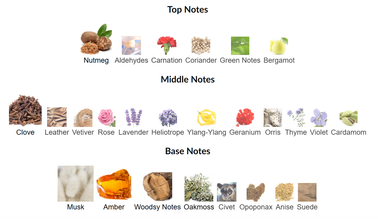 🔼 Nutmeg, Aldehydes, Carnation, Coriander, Green Notes and Bergamot