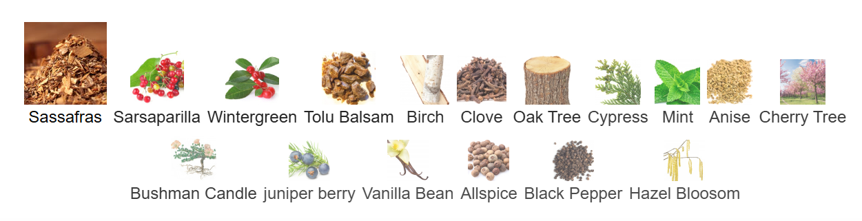 ⏺️ Sassafras, Sarsaparilla, Wintergreen, Tolu Balsam, Birch, Clove, Oak Tree, Cypress, Mint, Anise, Cherry Tree, Bushman Candle, Juniper Berry, Vanilla Bean, Allspice, Black Pepper and Hazel Blossom