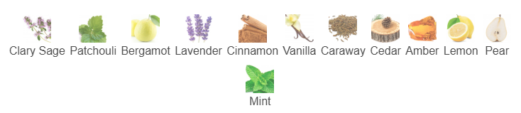 ⏺️ Clary Sage, Patchouli, Bergamot, Lavender, Cinnamon, Vanilla, Caraway, Cedar, Amber, Lemon, Pear and Mint