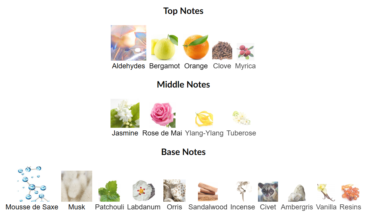 🔽 Mousse de Saxe, Musk, Patchouli, Labdanum, Orris, Sandalwood, Incense, Civet, Ambergris, Vanilla and Resins