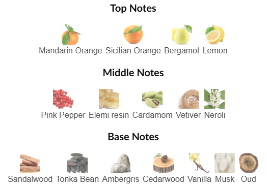 🔽 Sandalwood, Tonka Bean, Ambergris, Cedarwood, Vanilla, Musk and Oud