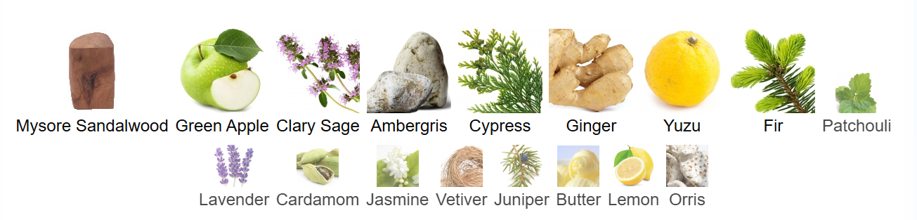 ⏺️ Yuzu, Buddhas Hand, Jasmine, Lemon, Cardamom, Ginger, Clary Sage, Juniper, Cypress, Orris, Lavender, Ambergris, Vetiver, Mysore Sandalwood, Patchouli, Green Apple and Fir Balsam
