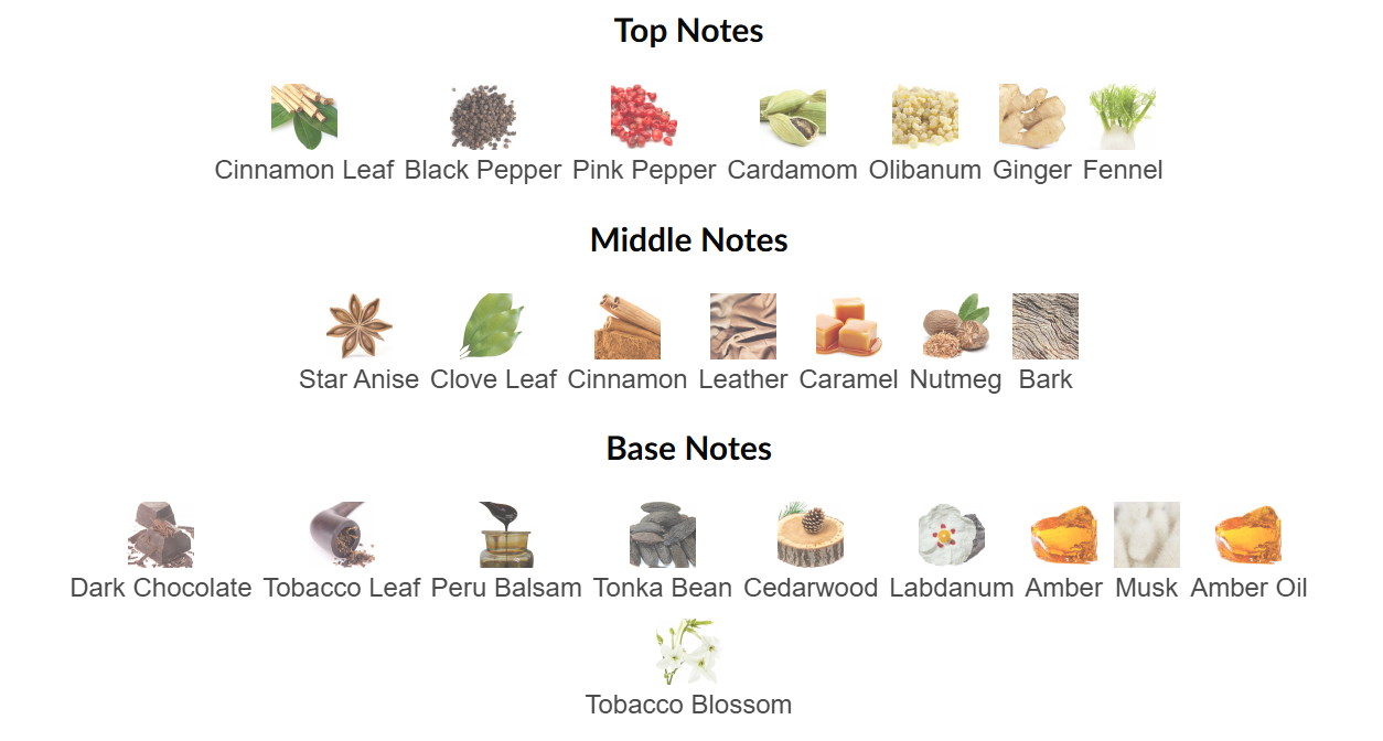 🔽 Cedarwood, Focalized Amber, Musk, Tonka Bean Absolute, Tobacco Leaf, Tobacco Flower and Dark Chocolate