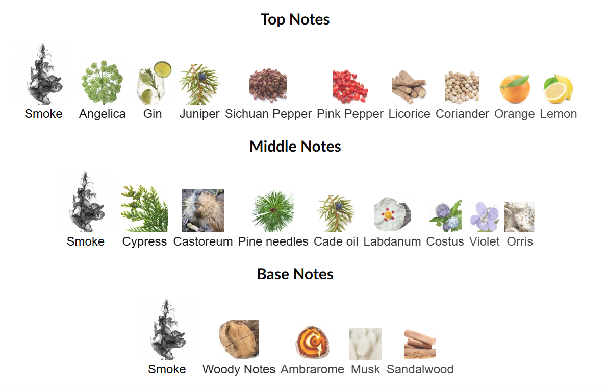 🔼 Smoke, Angelica, Gin, Juniper, Sichuan Pepper, Pink Pepper, Licorice, Coriander, Orange and Lemon