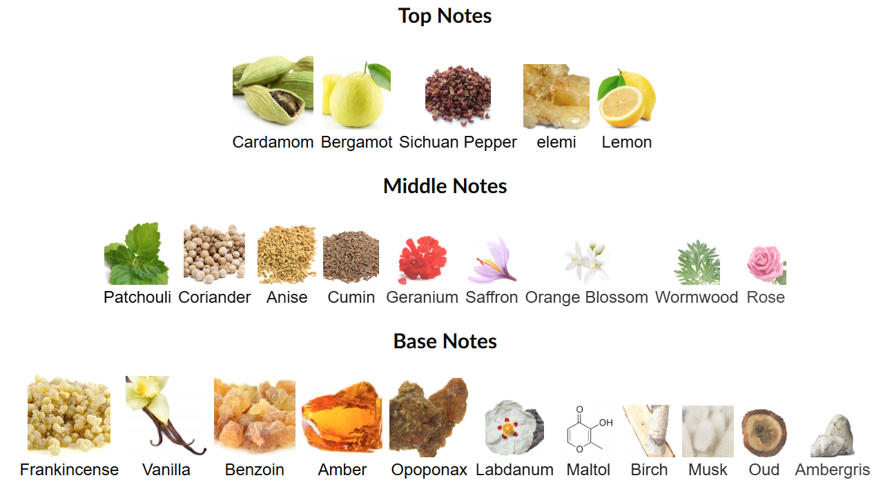 🔽 Frankincense, Vanilla, Benzoin, Amber, Oud, Birch, Ambroxan, Resins, Maltol, Labdanum and Musk