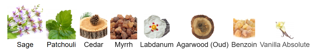 ⏺️ Sage, Patchouli, Cedar, Myrrh, Labdanum, Agarwood (Oud), Benzoin and Vanilla Absolute