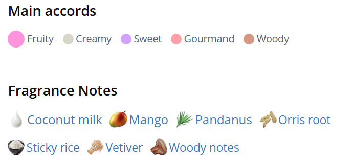 ⏺️ Coconut Milk, Mango, Pandanus, Orris Root, Sticky Rice, Vetiver and Woody Notes